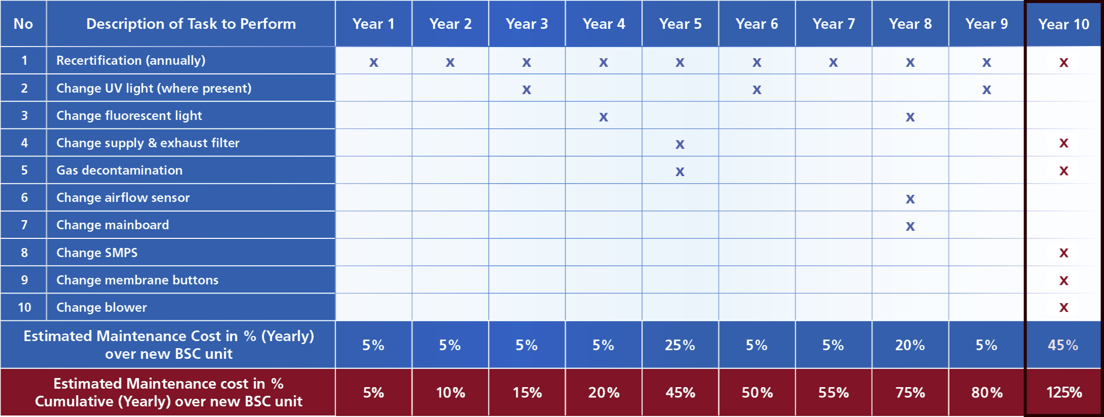As a BSC ages, maintenance costs can escalate significantly. By the tenth year, you could be spending an estimated 125% more on maintenance than the cost of purchasing a new BSC. This means that the cumulative maintenance costs over time will exceed the price of acquiring a new cabinet, making replacement a financially sound decision.
