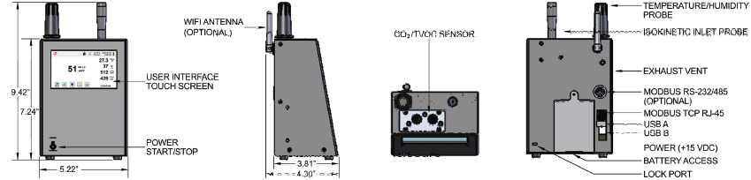 Optional Accessories Calibration cap for gas sensor, carrying case, external printer, isokinetic probes, barb fittings, spare battery, external battery charger, printed manual, and IMS-RT monitoring system