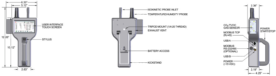 | Accessories | Operating Manual and IMS Software on USB flash drive, isokinetic probe, temperature relative humidity sensor, purge filter, battery, USB cable, and power supply |