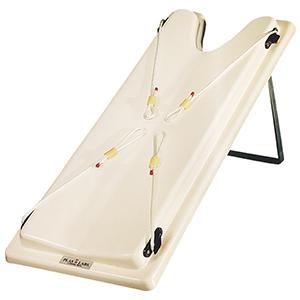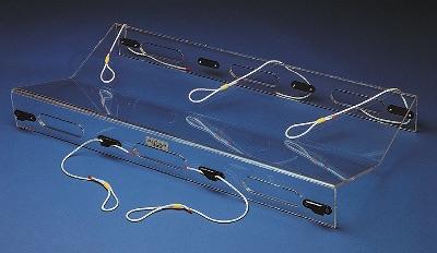 The positioner is fabricated of .375” thick autoclavable clear polycarbonate. It includes five Nylon restraint cords and fast acting locking cam cleats. Four machined openings on the sides provide excellent non-slip griping of the device.